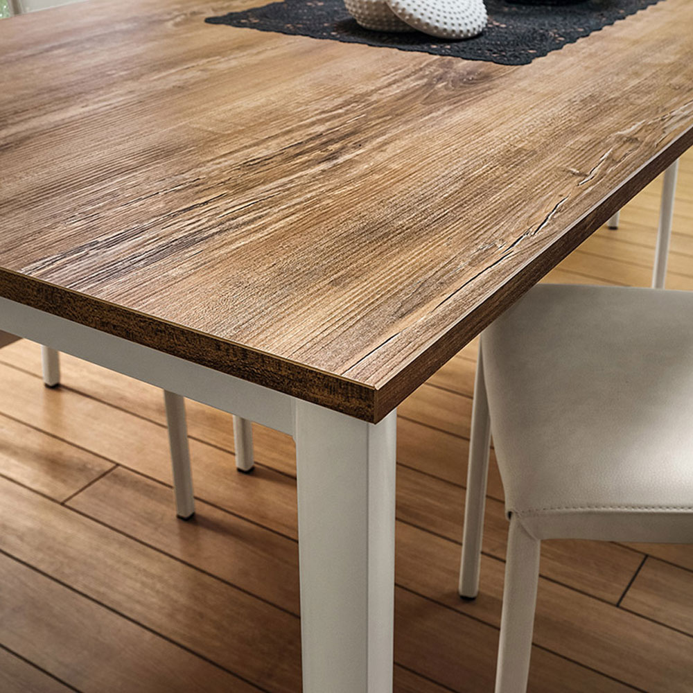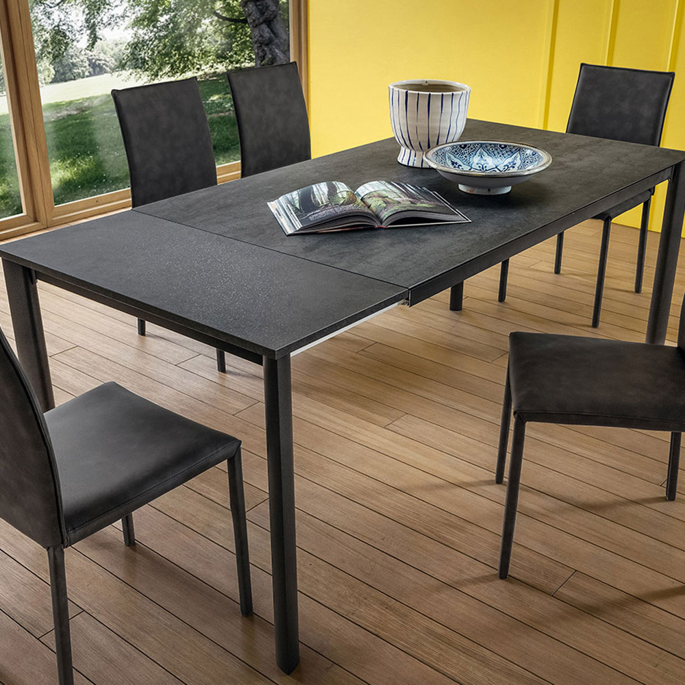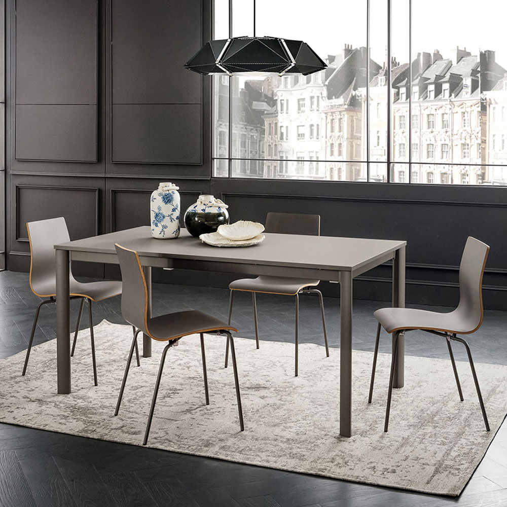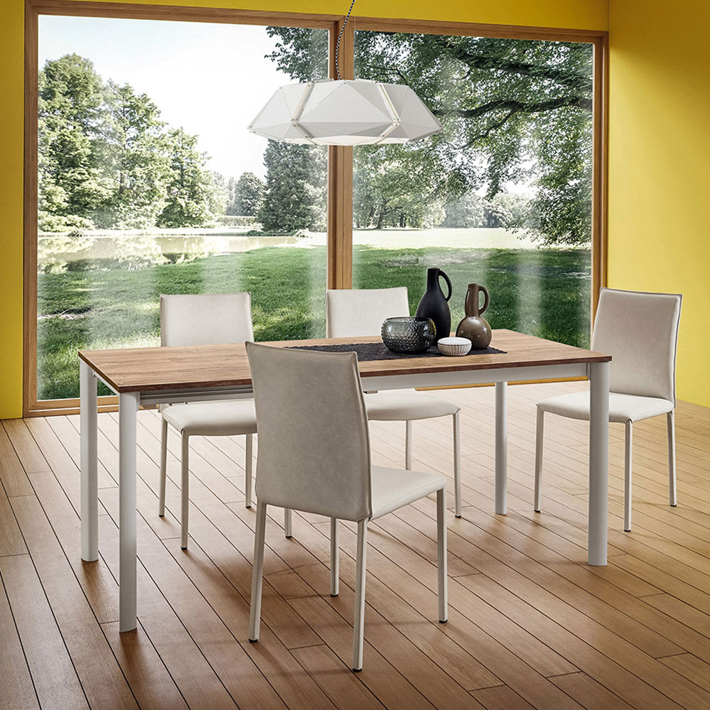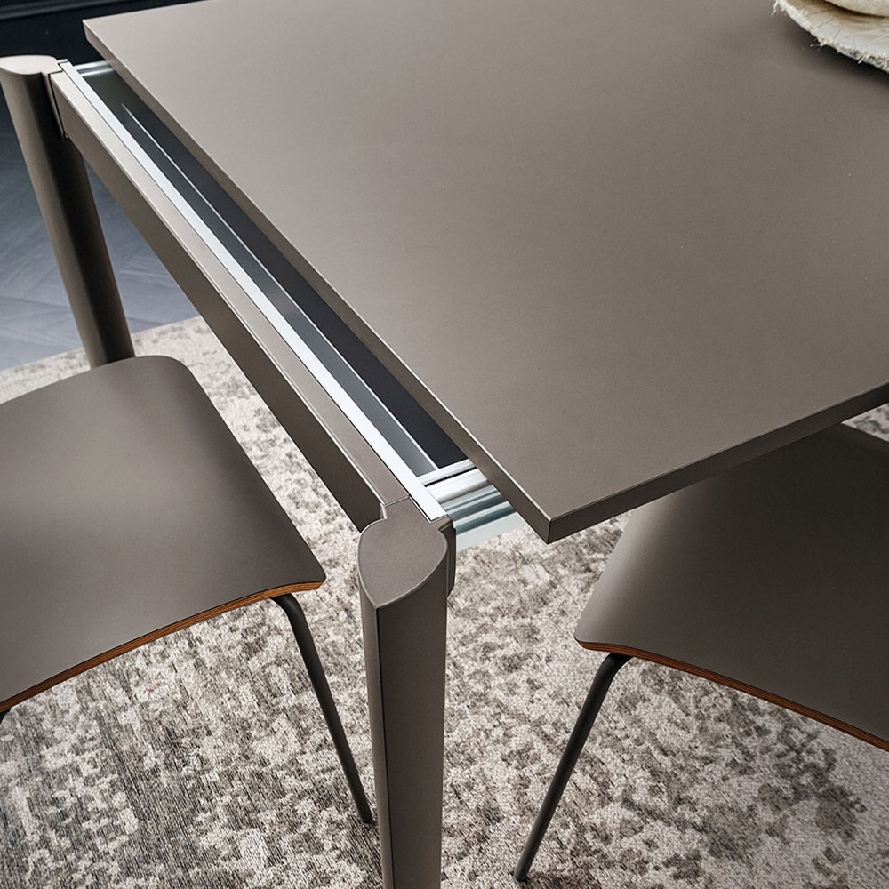 Masa extensibila pentru dining cu picioare din aluminiu anodizat si blat gros cu prelungiri taiate cu adezivi poliuretanici recativi.