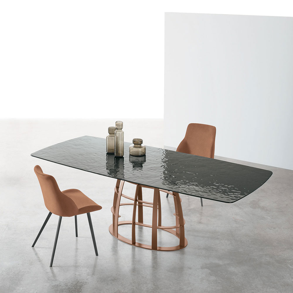Masa fixa cu baza din poliuretan si blat din sticla valurita. L 197 P 100 H 75 cm..