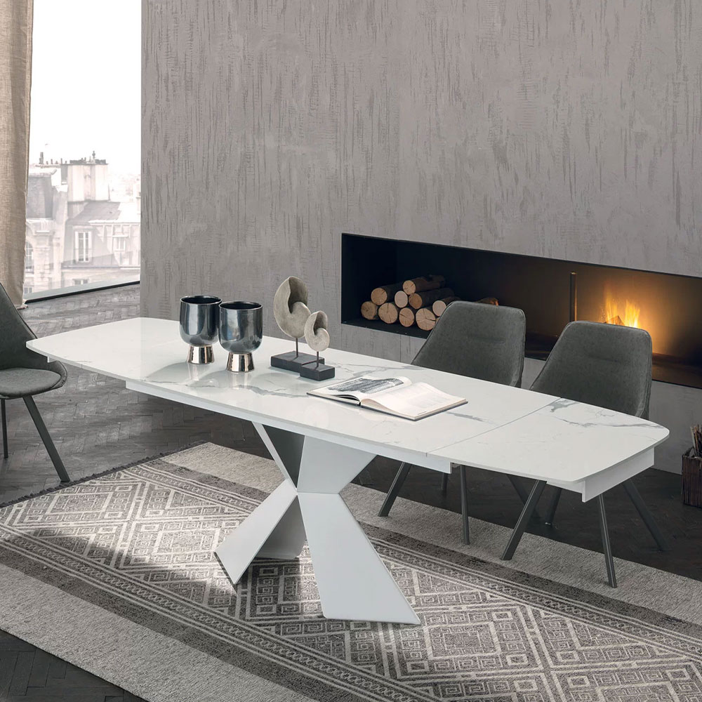 Masa extensibila cu structura metalica si blat din gresie portelanata sau sticla securizata.