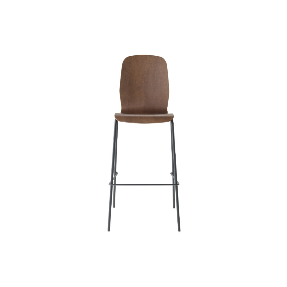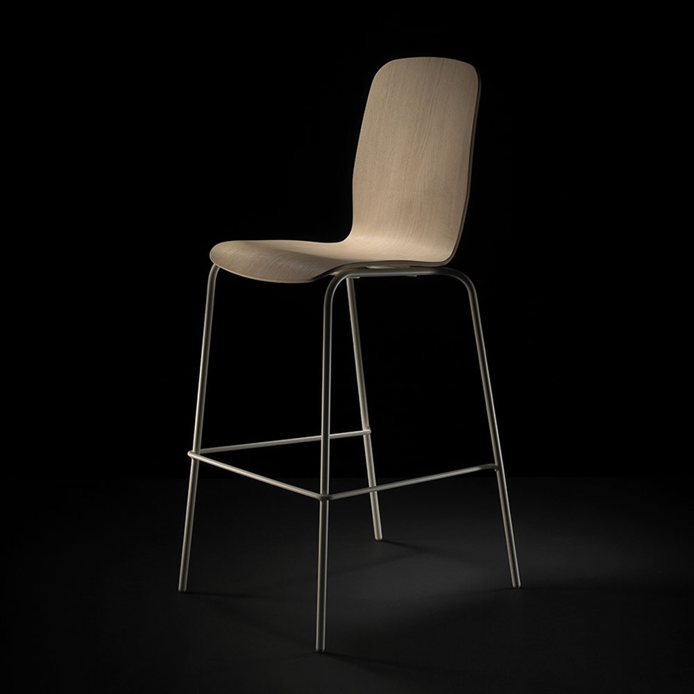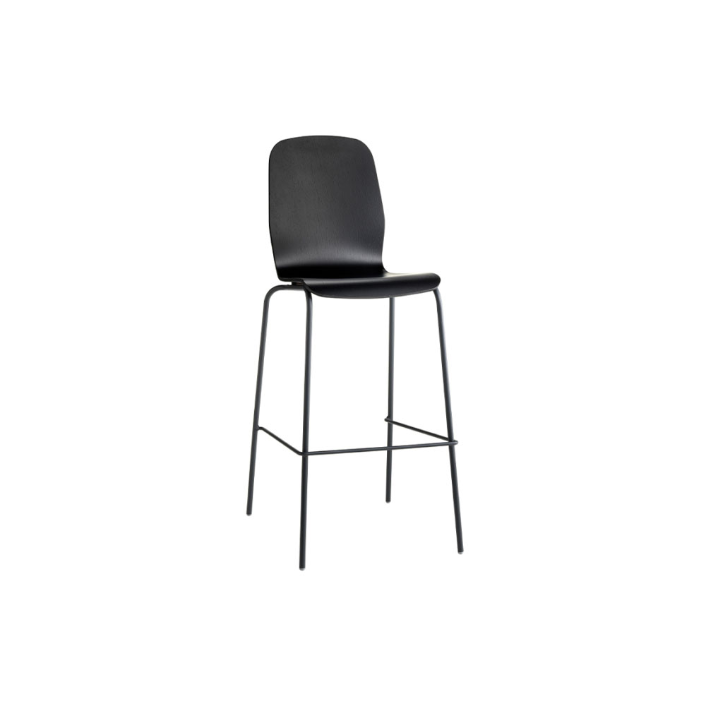 Scaun pentru bar cu cadru din otel vopsit si sezut din placaj de lemn.